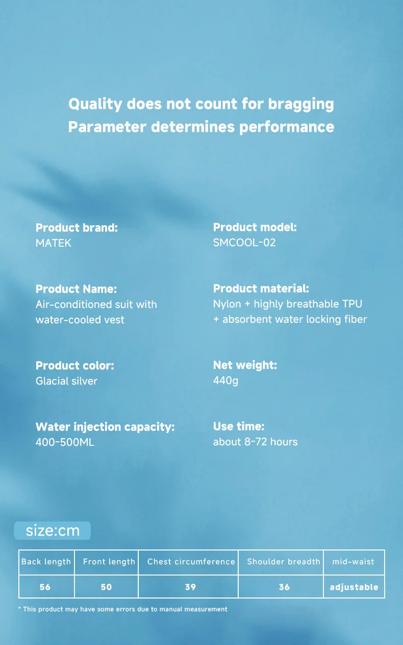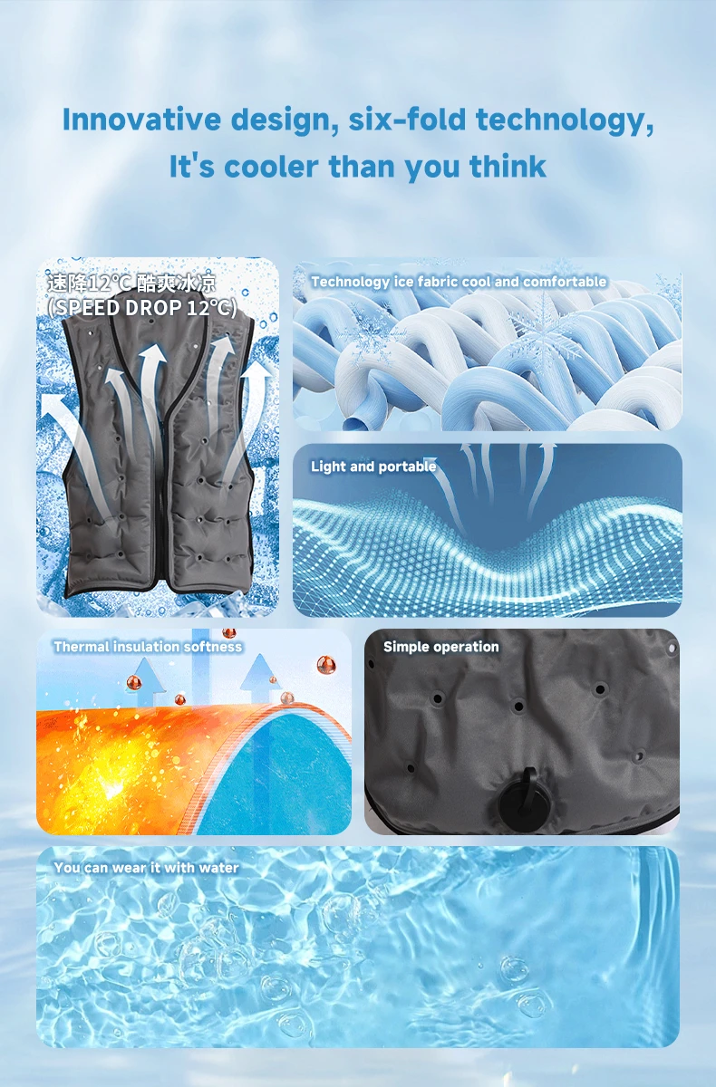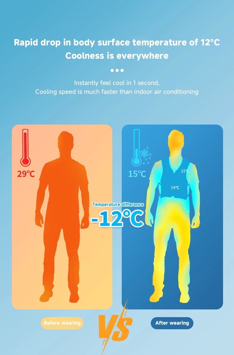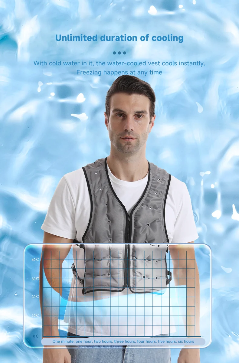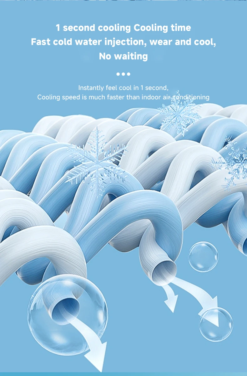 1 second cooling time,fast cold water injection,wear and cool,no need to wait even for seconds.Rapid drop in body surface temperature of 12°C,coldnees is everywhere,With cold water in it,the water-cooled vest cools instantly,freezing happens at any time.the cold cooling can last for six hours.