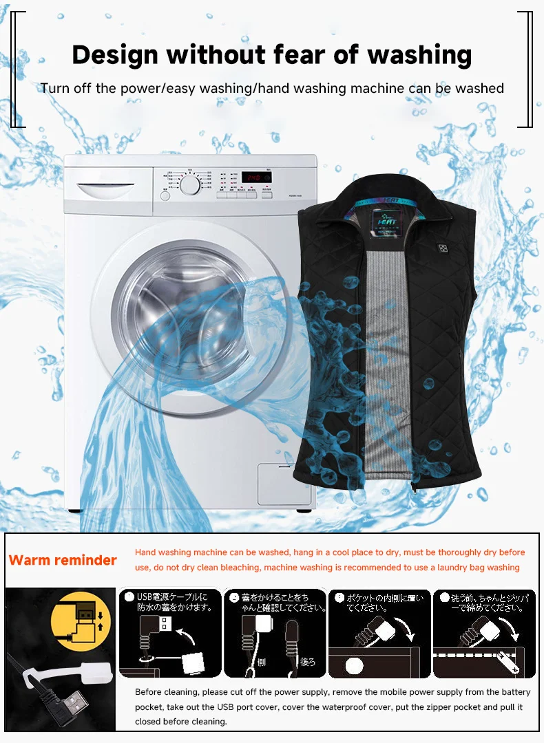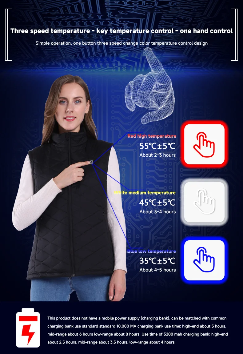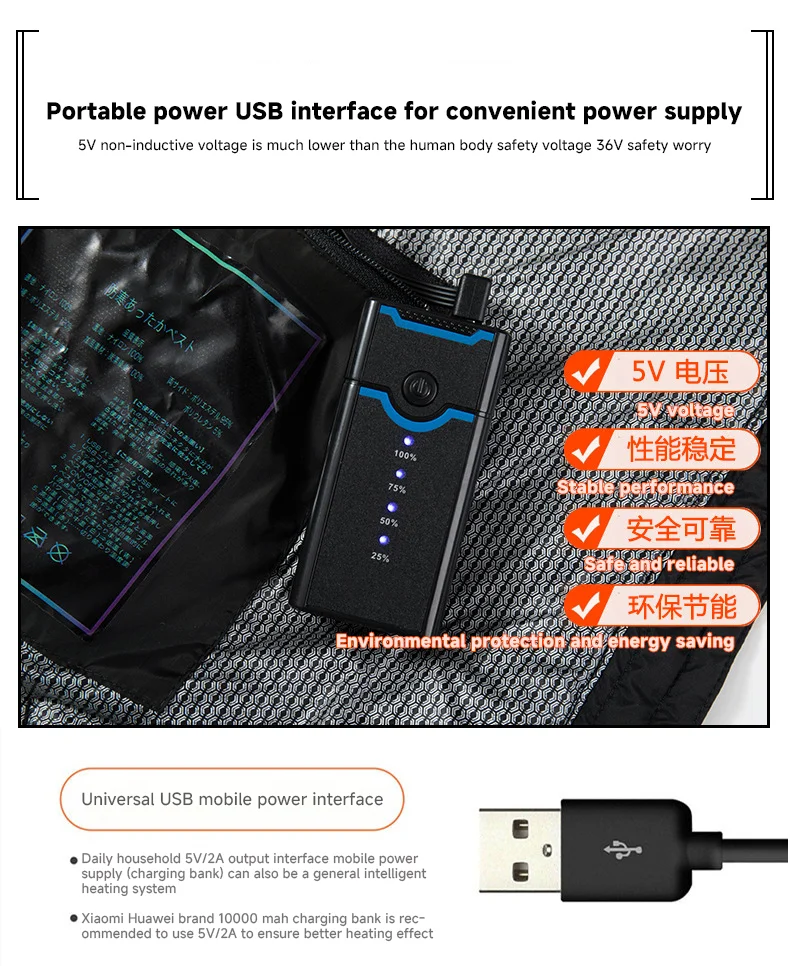 3.(women USB Battery Heated Jacket Men) Daily household 5V/2A output interface mobile power supply (charging bank) can also be a general intelligent heating system;