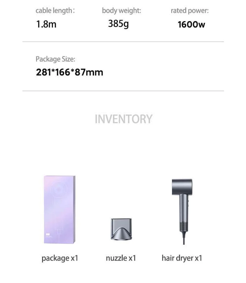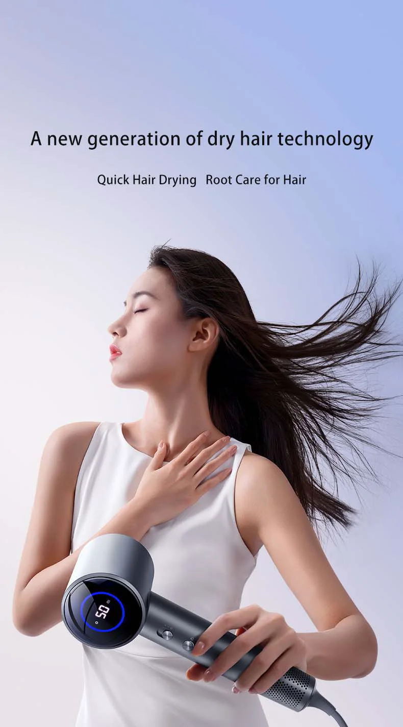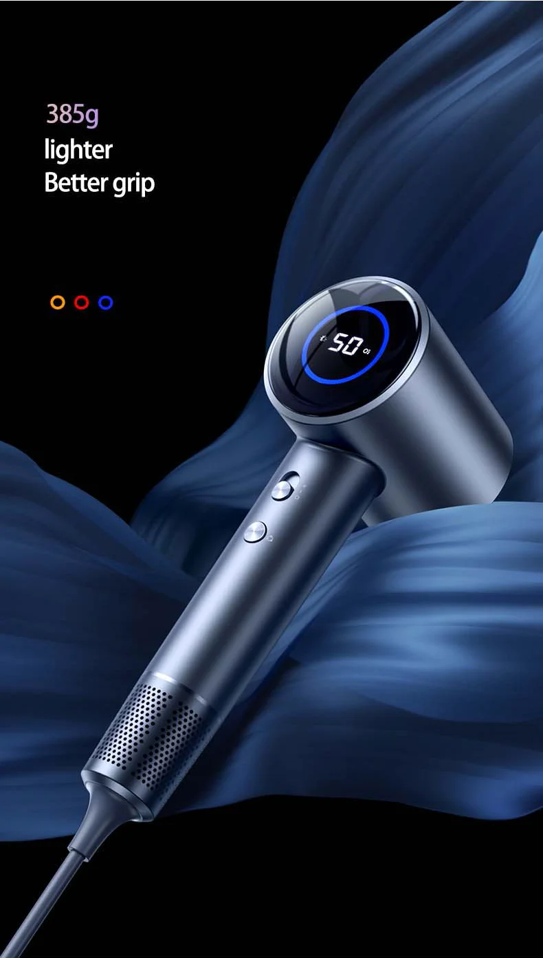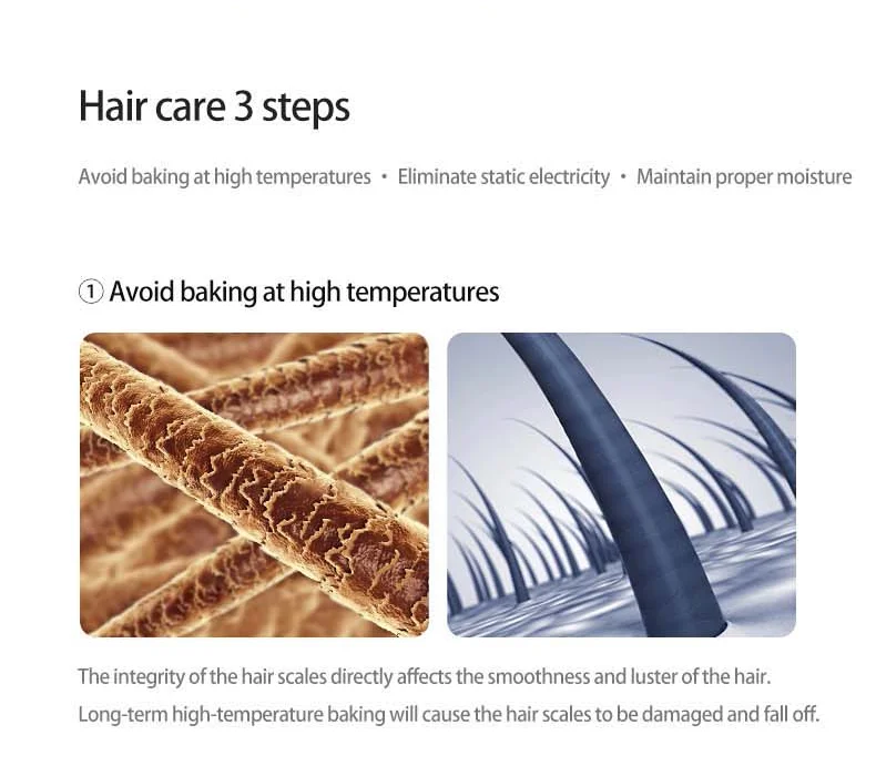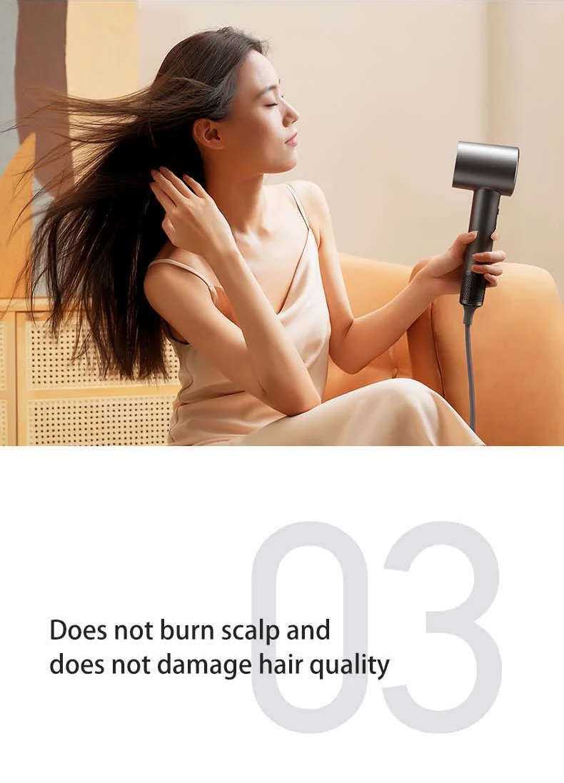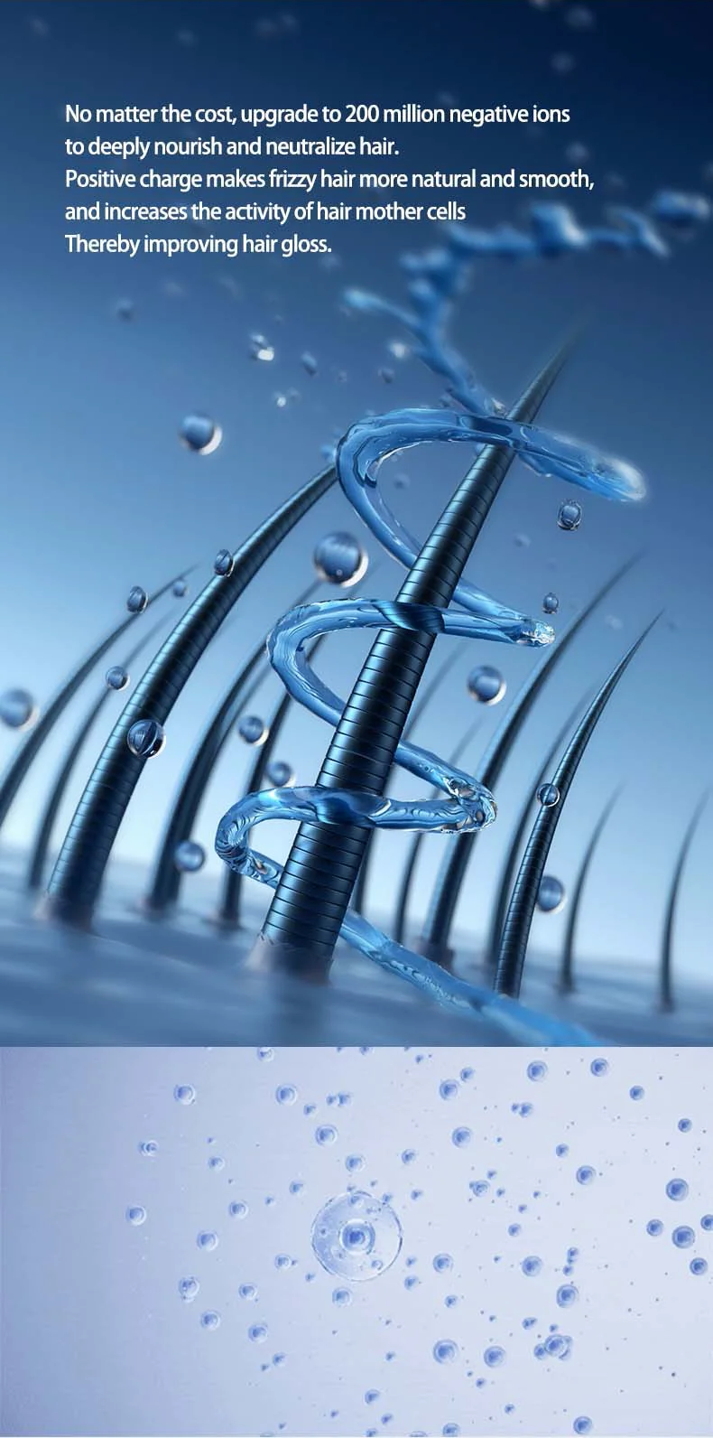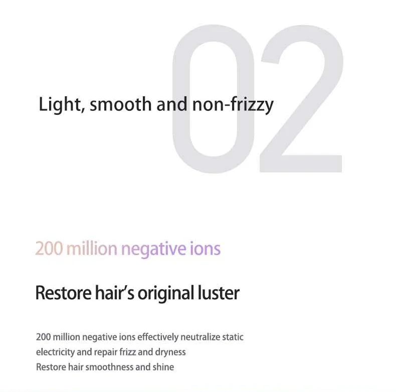 The blow dryer generates millions of negative ions during use, which penetrate to the hair roots to improve hair moisture and scale health. This effectively eliminates static electricity and maintains the hair's silky smoothness and frizz-free quality, enhancing the natural lustre