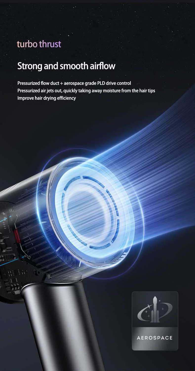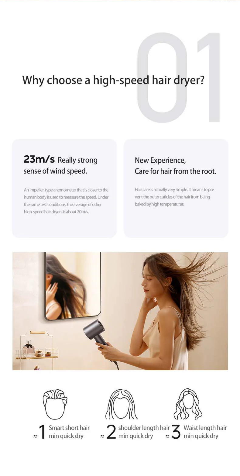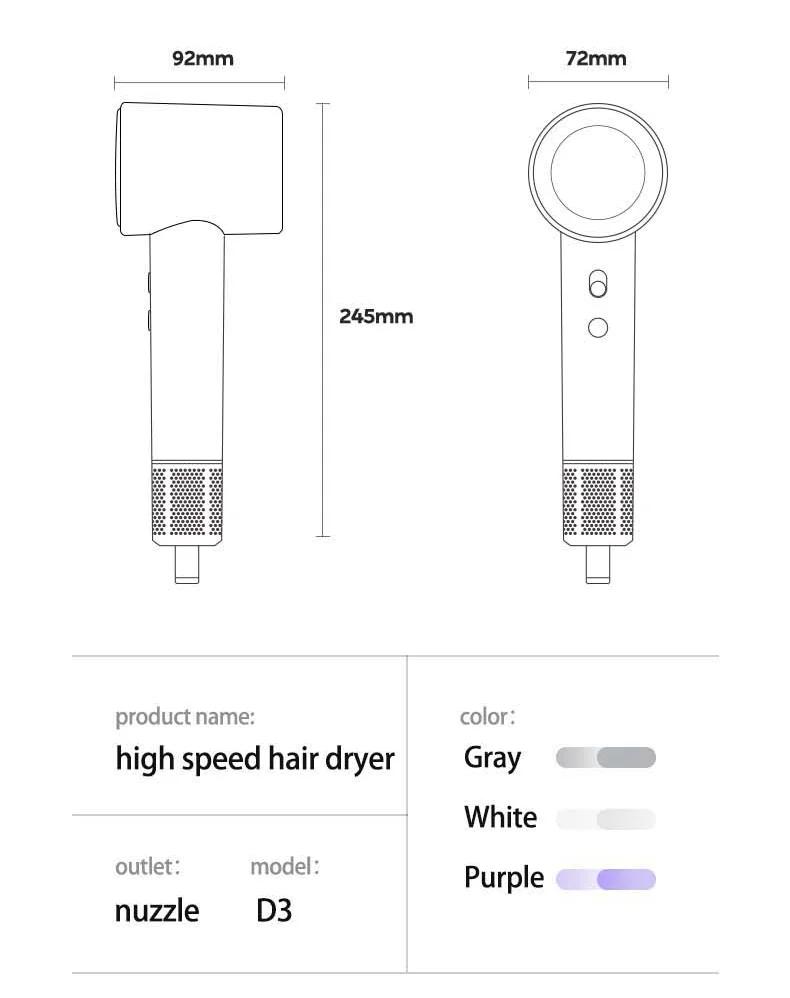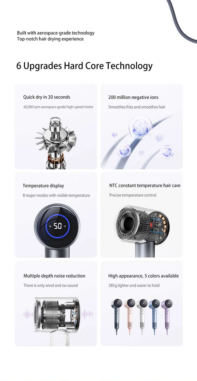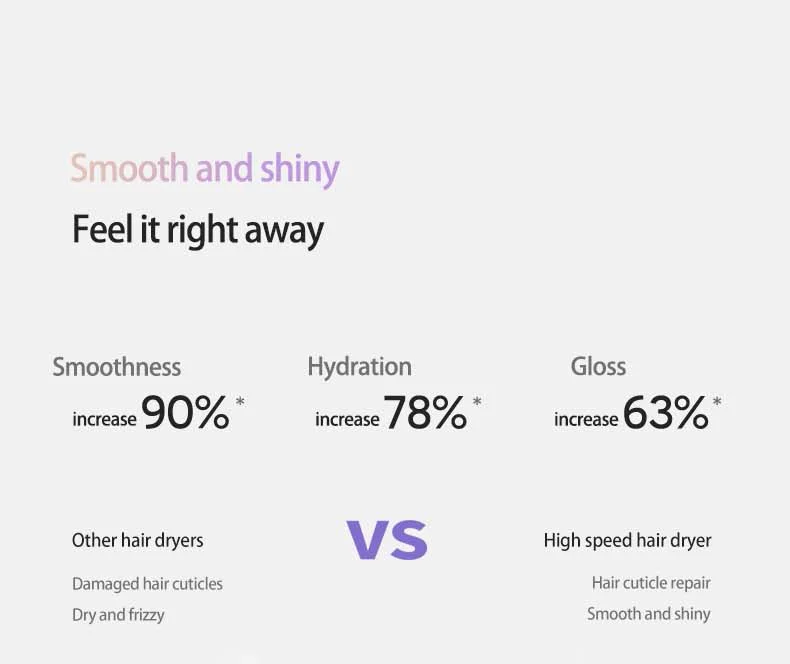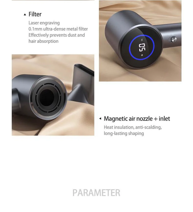 The blow dryer generates millions of negative ions during use, which penetrate to the hair roots to improve hair moisture and scale health. This effectively eliminates static electricity and maintains the hair's silky smoothness and frizz-free quality, enhancing the natural lustre